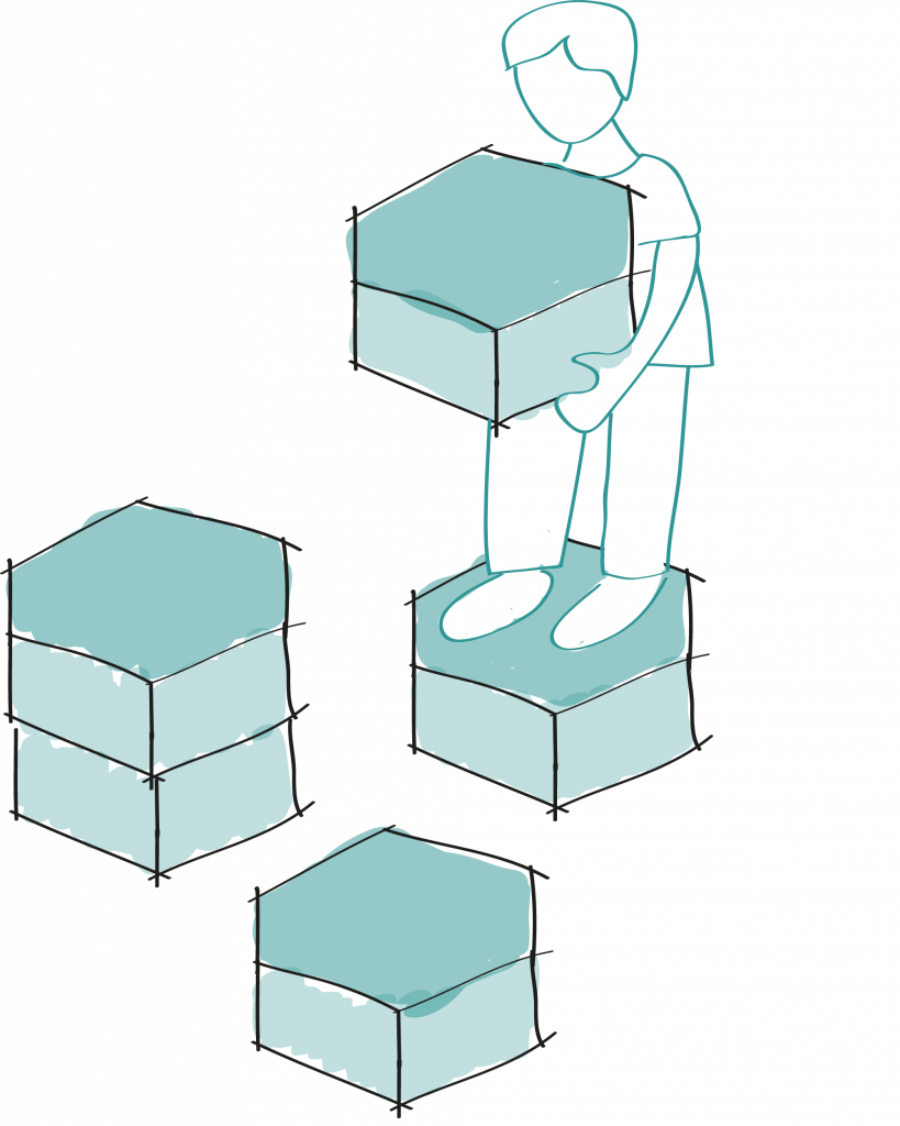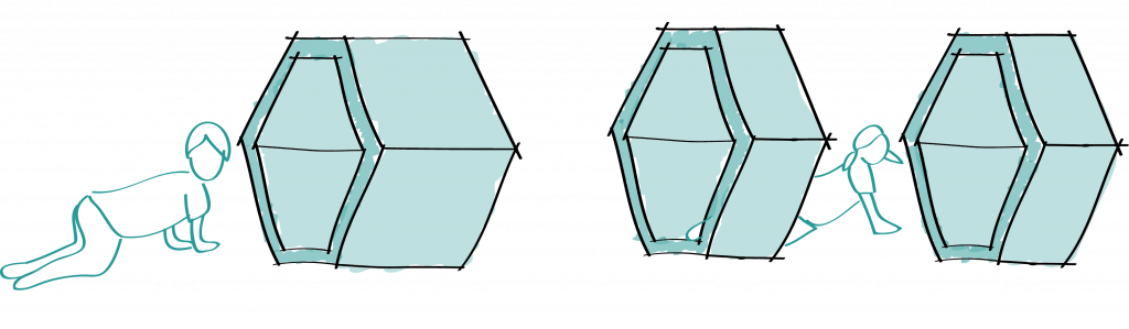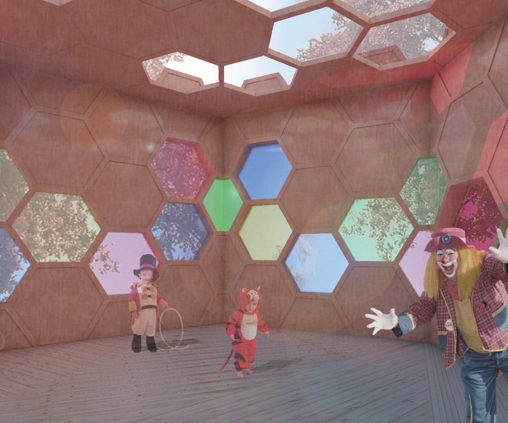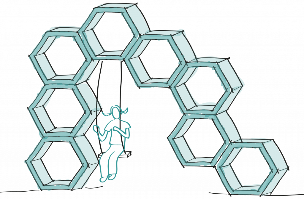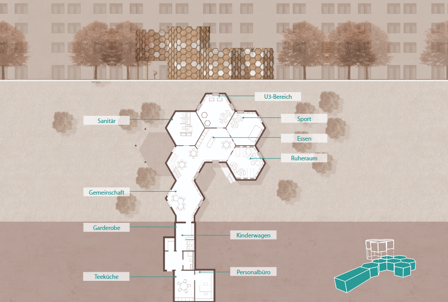 Die gewählte Wabenform bildet die geometrische Grundlage des Konzepts. Sie ermöglicht eine flexible und logische Erweiterung der Module und dient zugleich als gestalterisches Leitmotiv. Aus der Wabenstruktur lassen sich zudem unterschiedliche Spielgeräte entwickeln, die das Corporate Design der neu entwickelten Kindergartenmarke unterstützen und räumlich erlebbar machen.